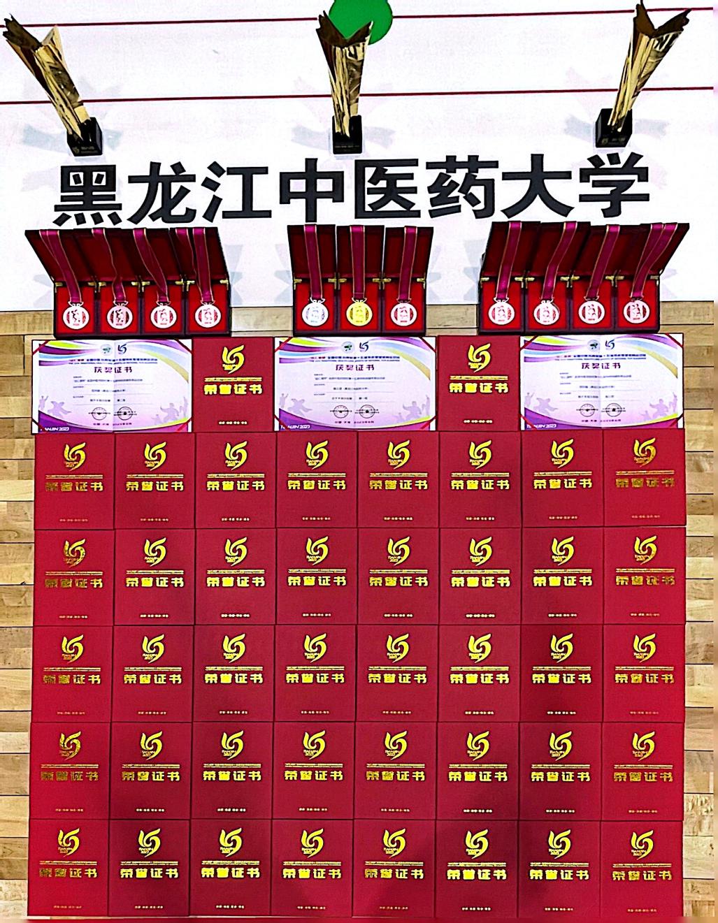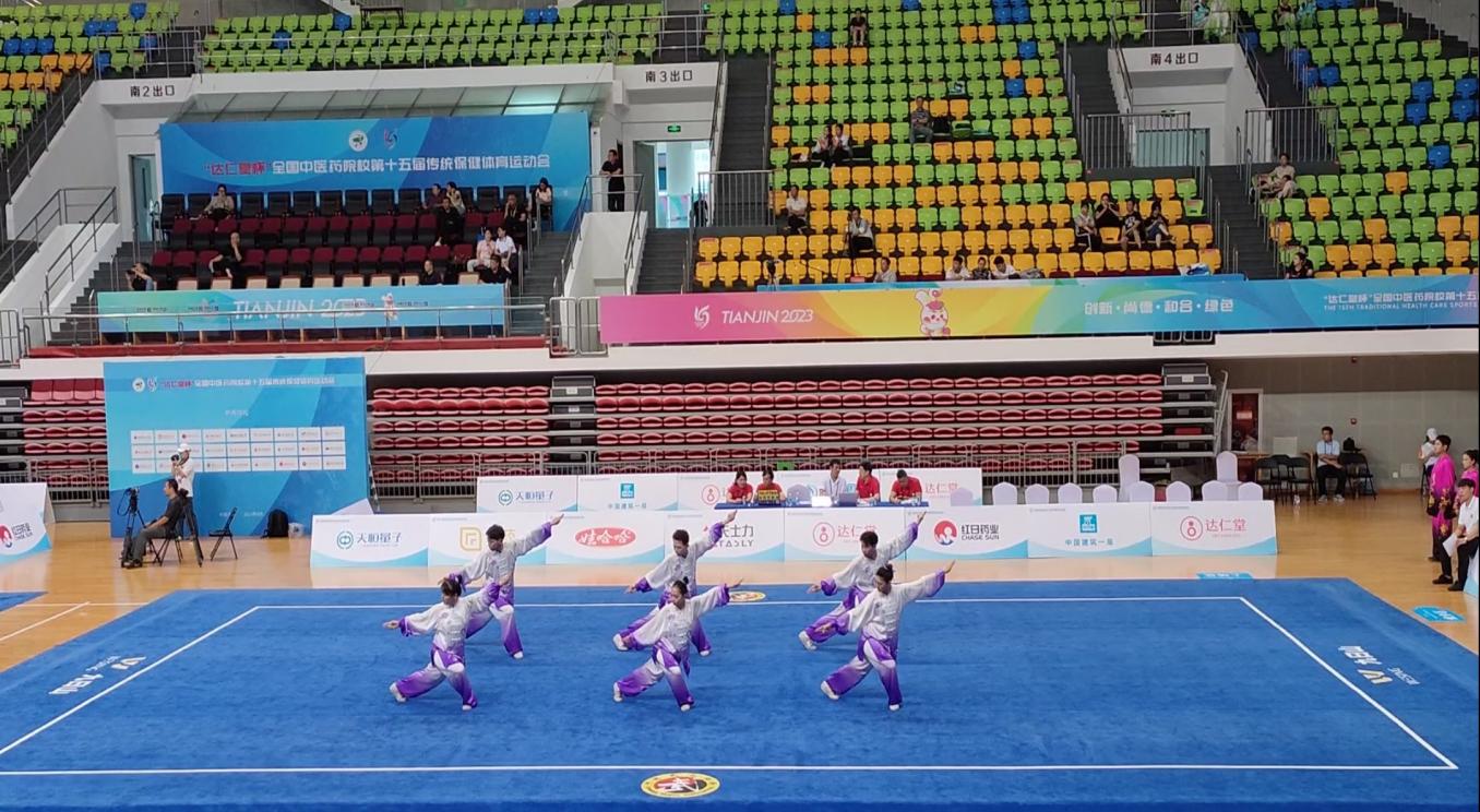 我校武术代表队选派13名学生运动员参赛,由体育教研部主任陈达光担任领队、副主任侯建鹏担任总教练员,刘巍、韩旭、吴佳坤担任教练员。经过激烈争夺,我校学生曾玉滢获女子B组太极拳金牌;范开颜获男子B组太极拳银牌、男子B组太极剑铜牌;肖心怡获女子B组三类拳铜牌;唐伟彬获男子B组南棍铜牌;李泰琨、卢家霖、刘茹等获自编器械保健功法铜牌、规定功法七星功第5名,全体队员获集体24式太极拳第6名;杜梦星获体育道德风尚运动员。我校团体总分在27所中医药院校代表团中位居第7名,学校荣获体育道德风尚奖单位荣誉称号。