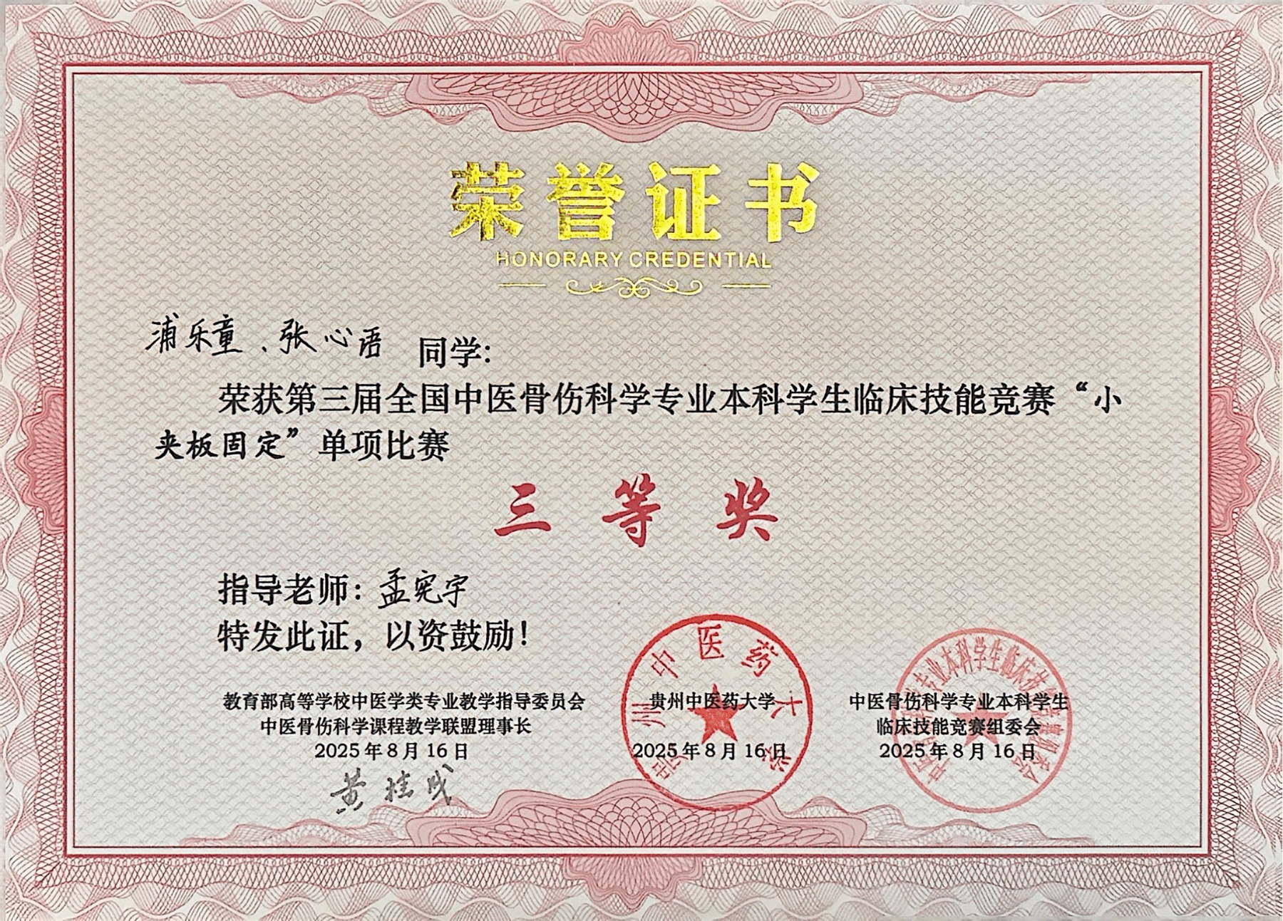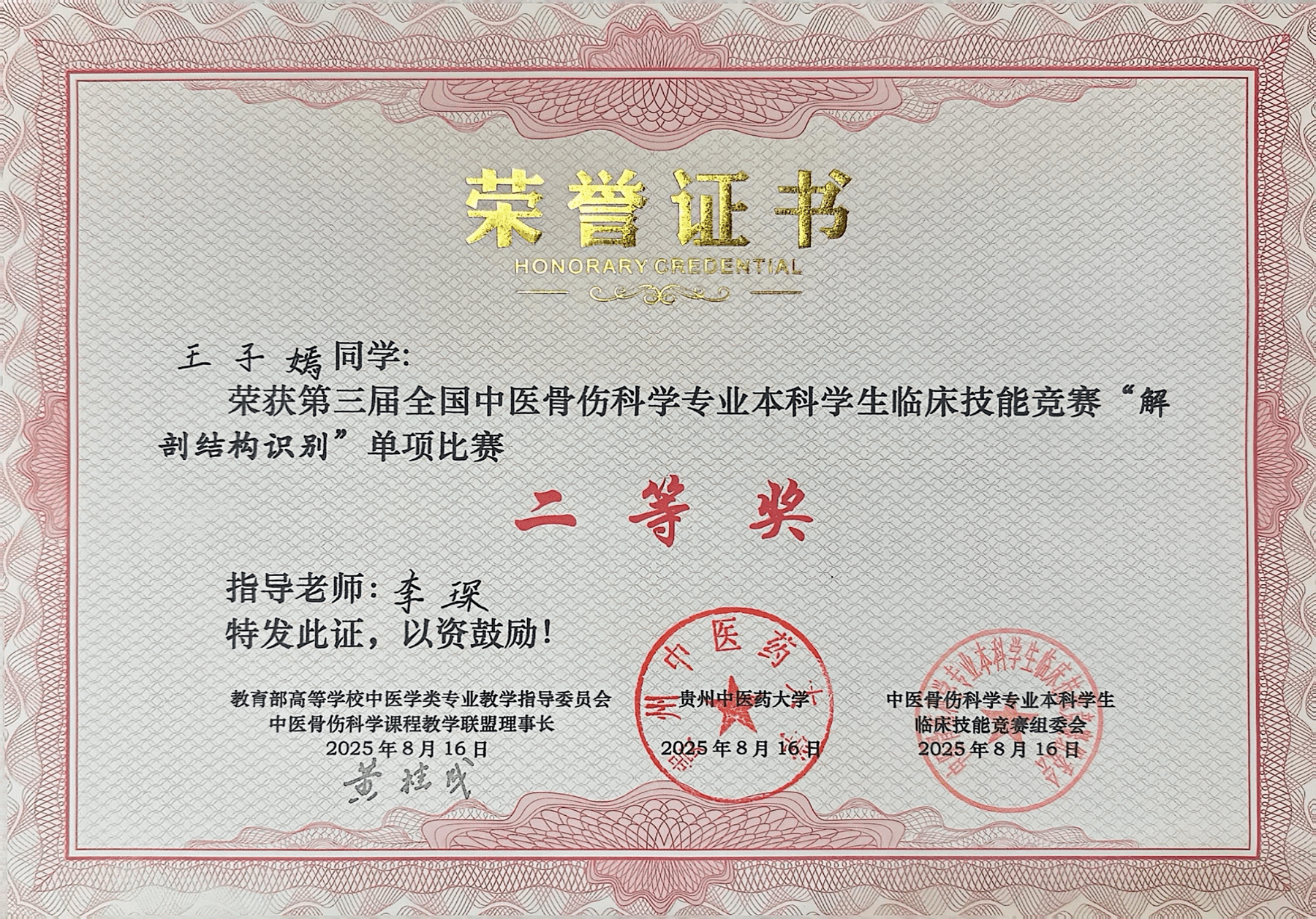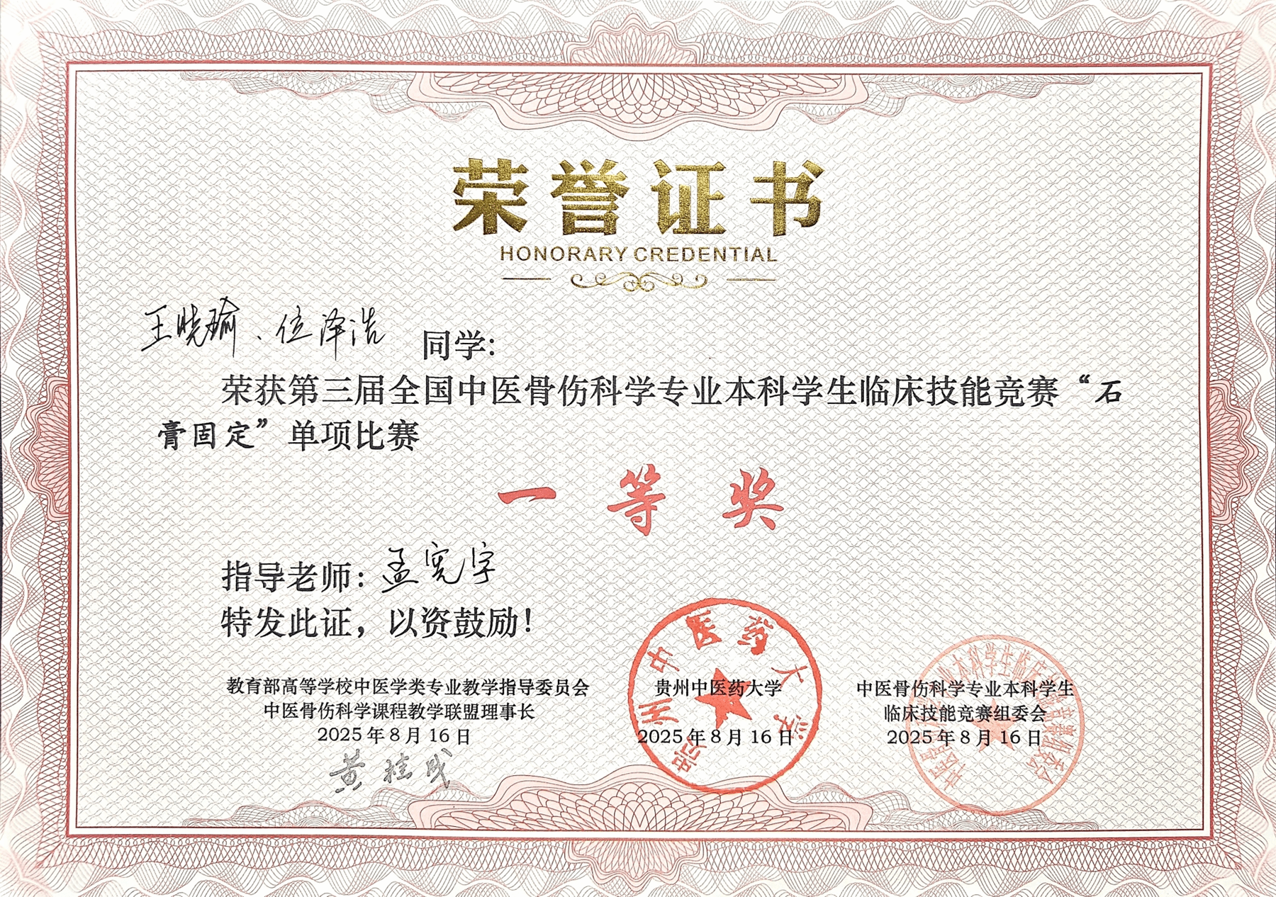 8月15日至17日,由教育部高等学校中医学类专业教学指导委员会中医骨伤科学课程教学联盟主办,贵州中医药大学承办的“传正骨之精粹·育骨伤之英才”第二届全国中医药院校中医骨伤科学专业建设与人才培养研讨会暨第三届全国中医骨伤科学专业本科学生临床技能竞赛在贵阳举行,我校选派师生参加活动并获得佳绩。