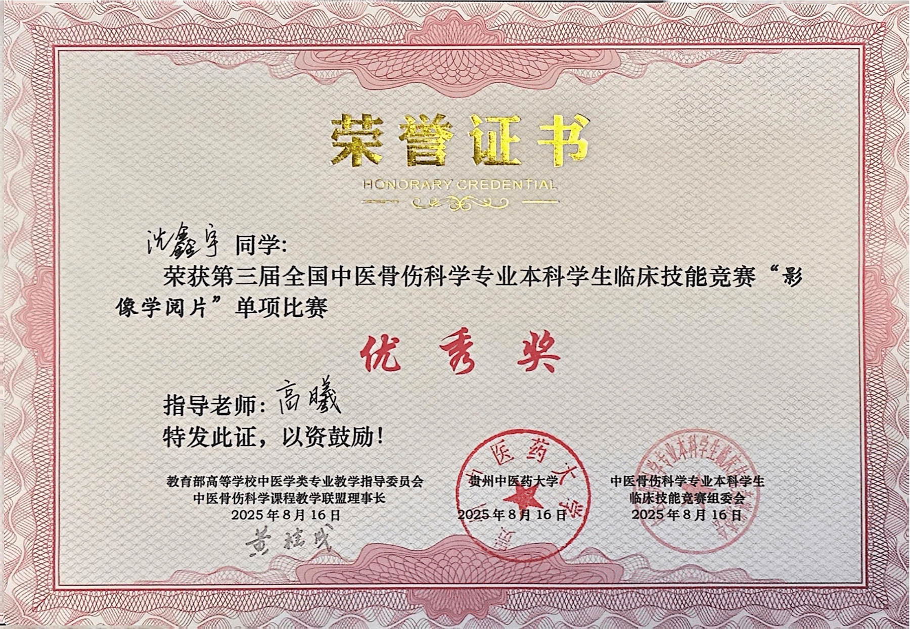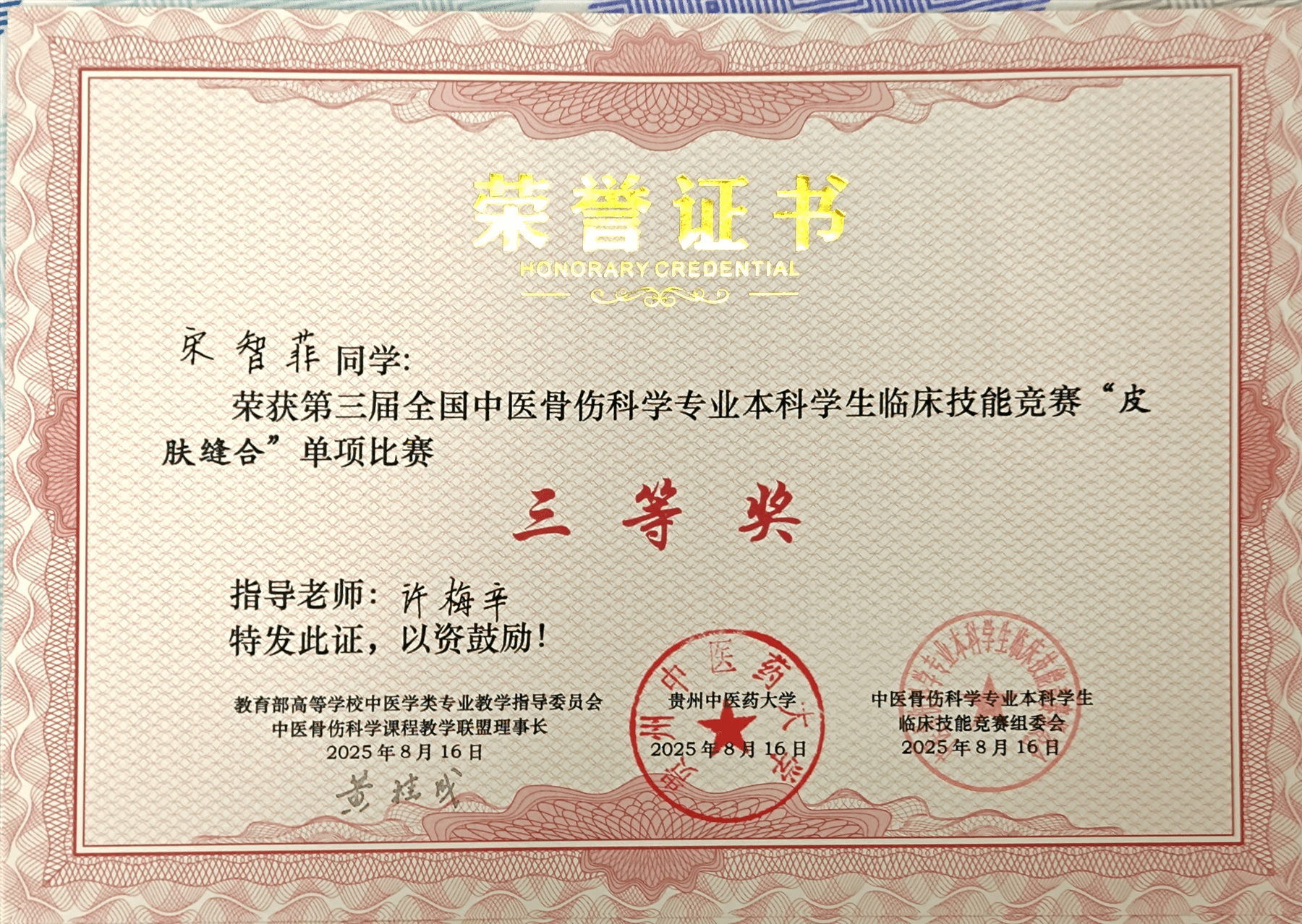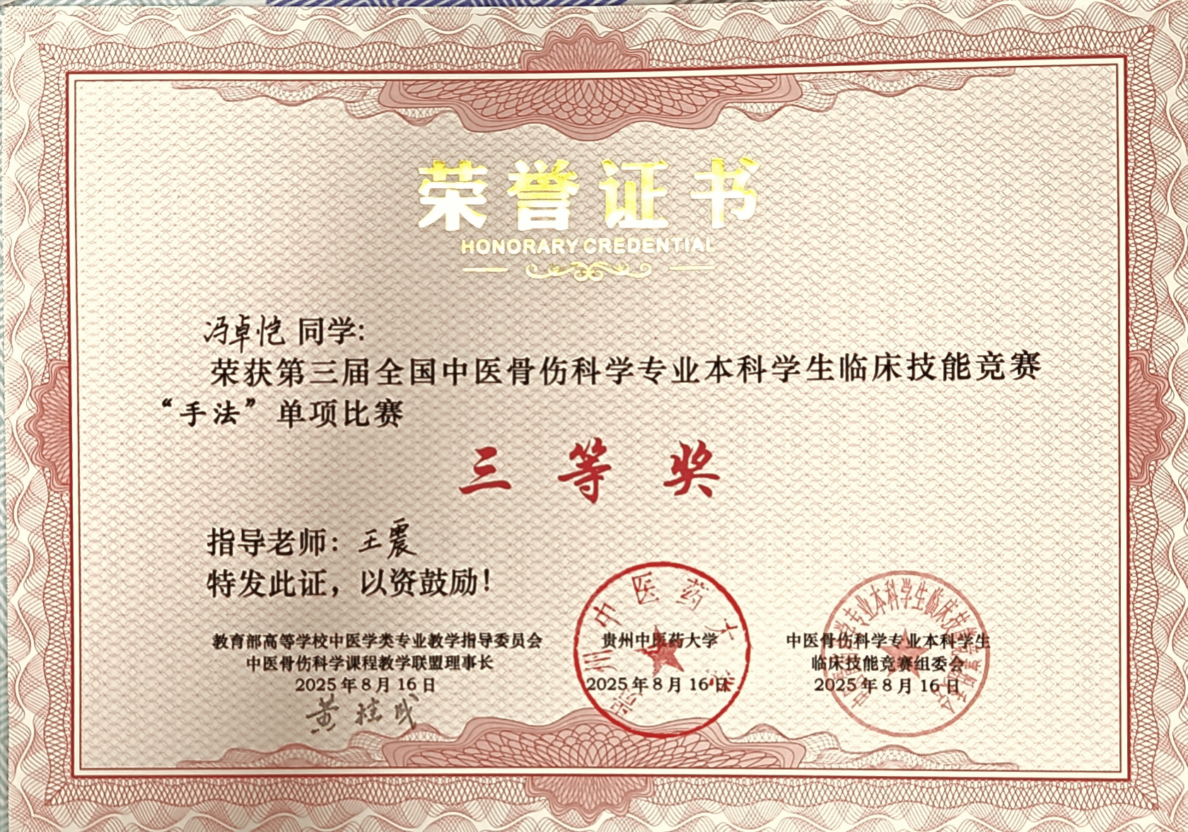 8月15日至17日,由教育部高等学校中医学类专业教学指导委员会中医骨伤科学课程教学联盟主办,贵州中医药大学承办的“传正骨之精粹·育骨伤之英才”第二届全国中医药院校中医骨伤科学专业建设与人才培养研讨会暨第三届全国中医骨伤科学专业本科学生临床技能竞赛在贵阳举行,我校选派师生参加活动并获得佳绩。