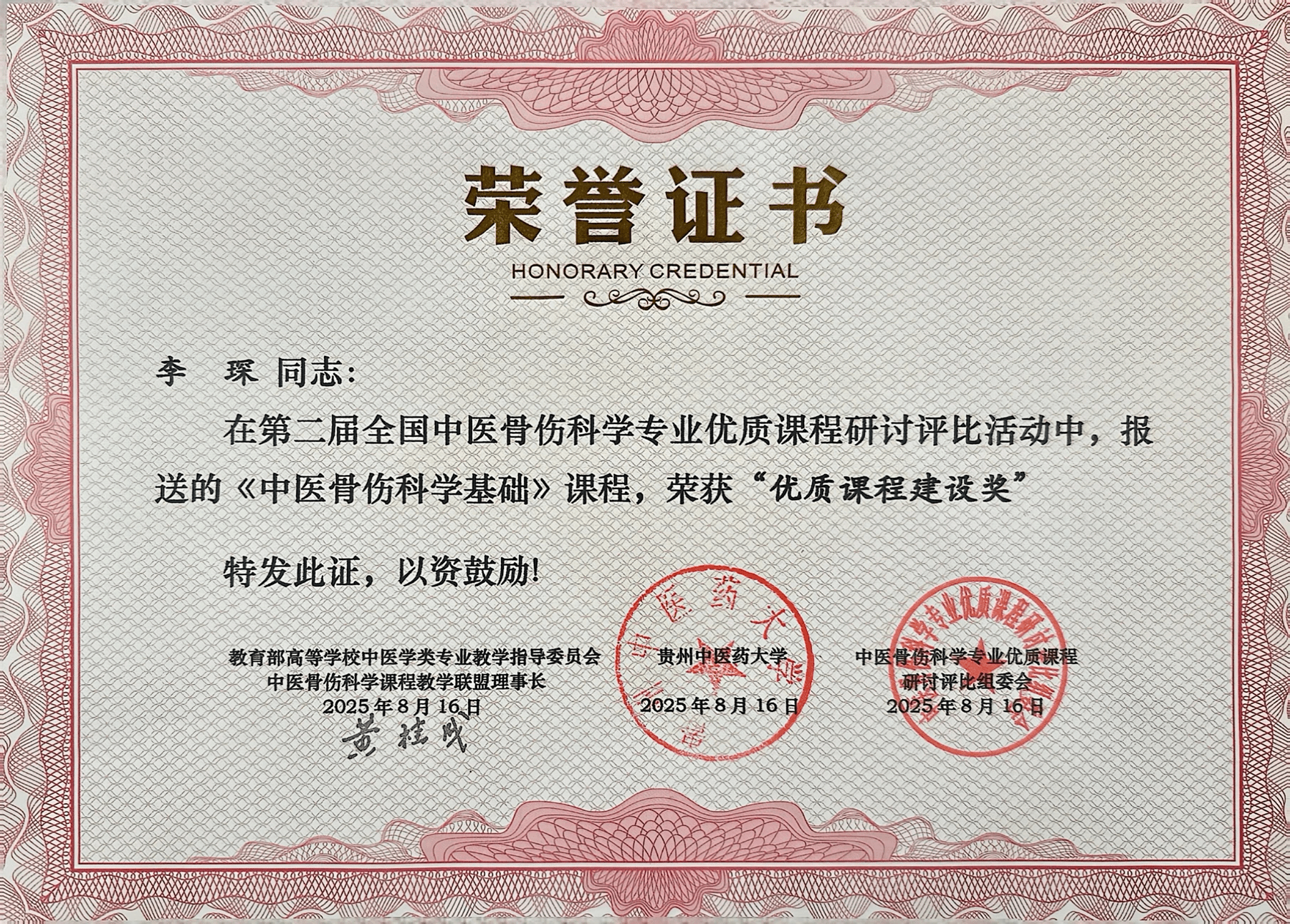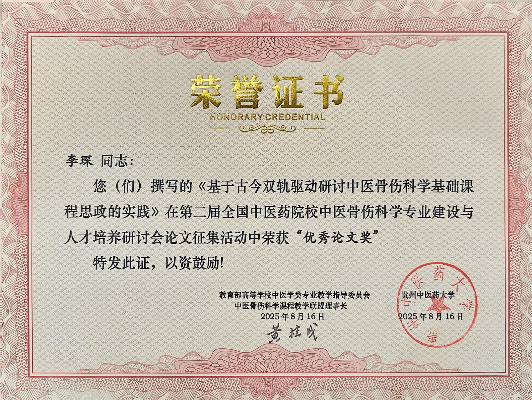 此外,附属第一医院李琛老师撰写的题为《基于古今双轨驱动研讨中医骨伤科学基础课程思政的实践》在论文征集活动中荣获“优秀论文奖”,《中医骨伤科学基础》在优质课程研讨评比活动中荣获“优质课程建设奖”。