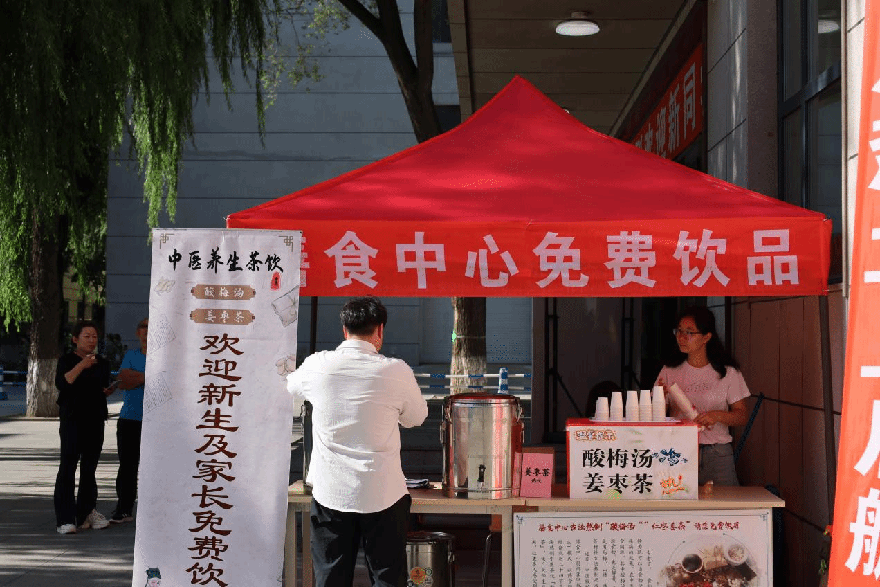 学校后勤管理处在膳食中心为学生及家长准备了酸梅汤和姜枣茶,公寓部热烈欢迎新同学的到来。