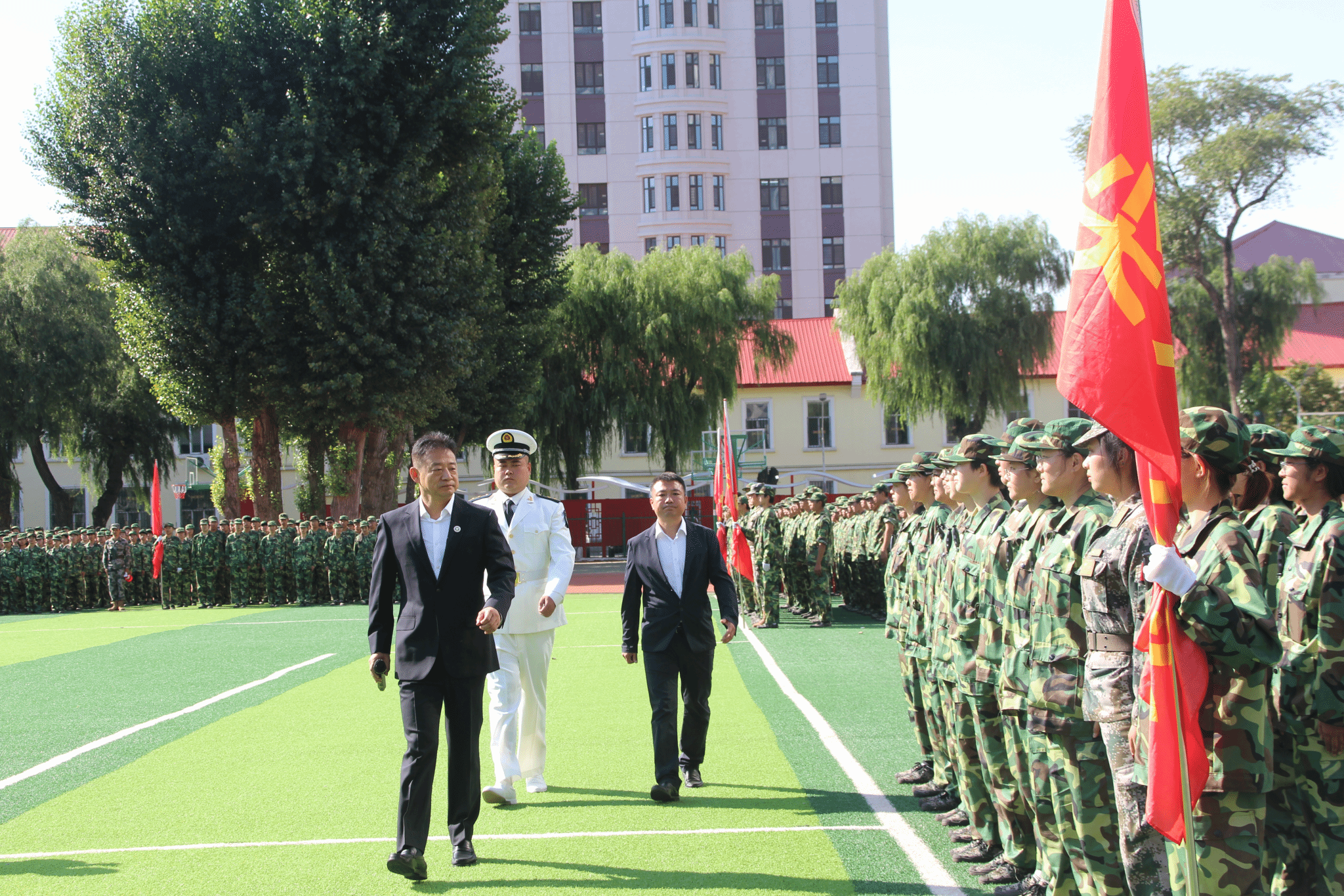 校长郭宏伟检阅2025级学生队列方阵,体育教研部主任陈达光陪同检阅。