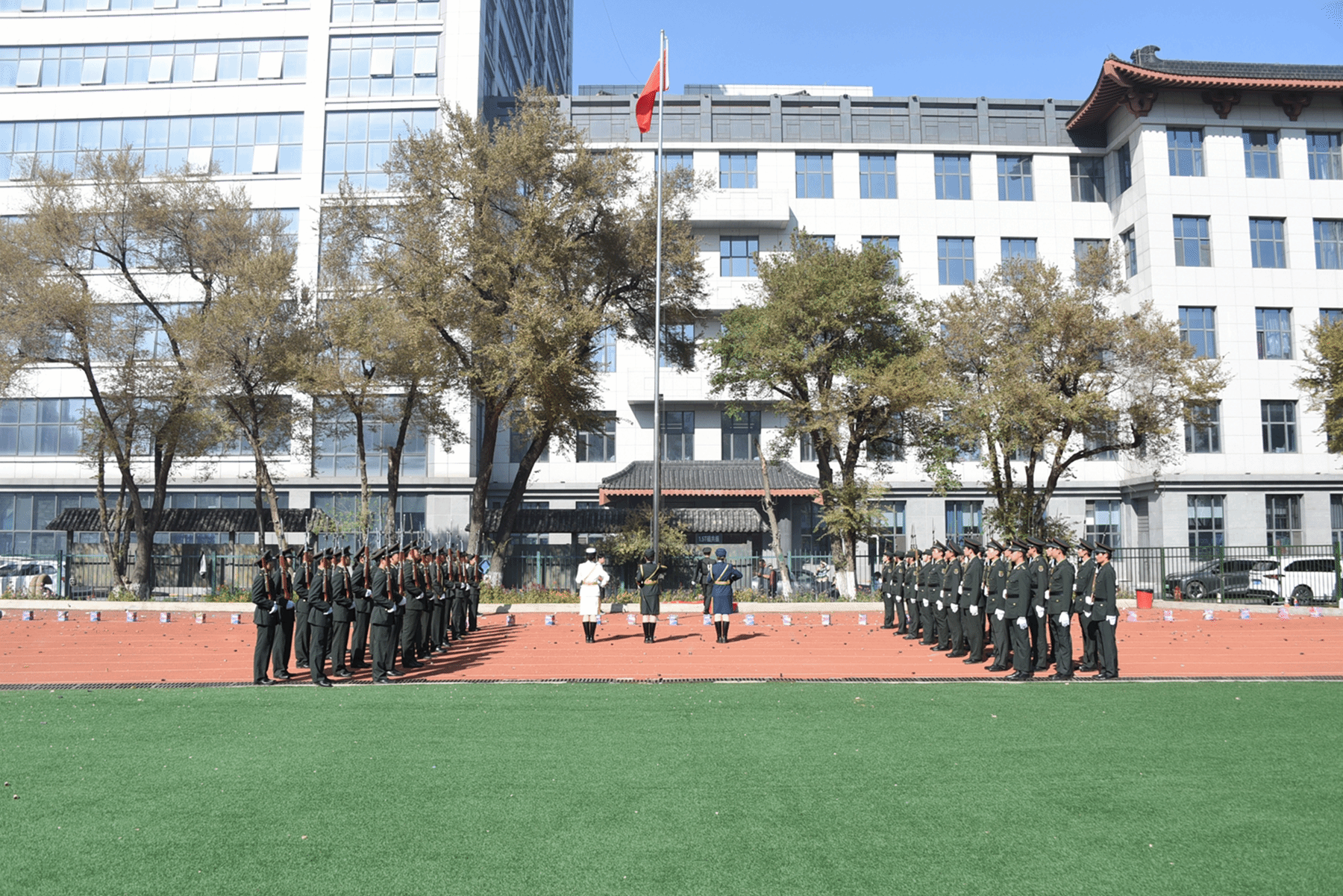 14时,大会在庄严的国歌声中开幕。英姿飒爽的国旗护卫队队员们迈着庄严而整齐的步伐,护送鲜艳的五星红旗进场。伴随着庄严的中华人民共和国国歌,五星红旗冉冉升起,全体参会师生面向国旗行军礼、注目礼。