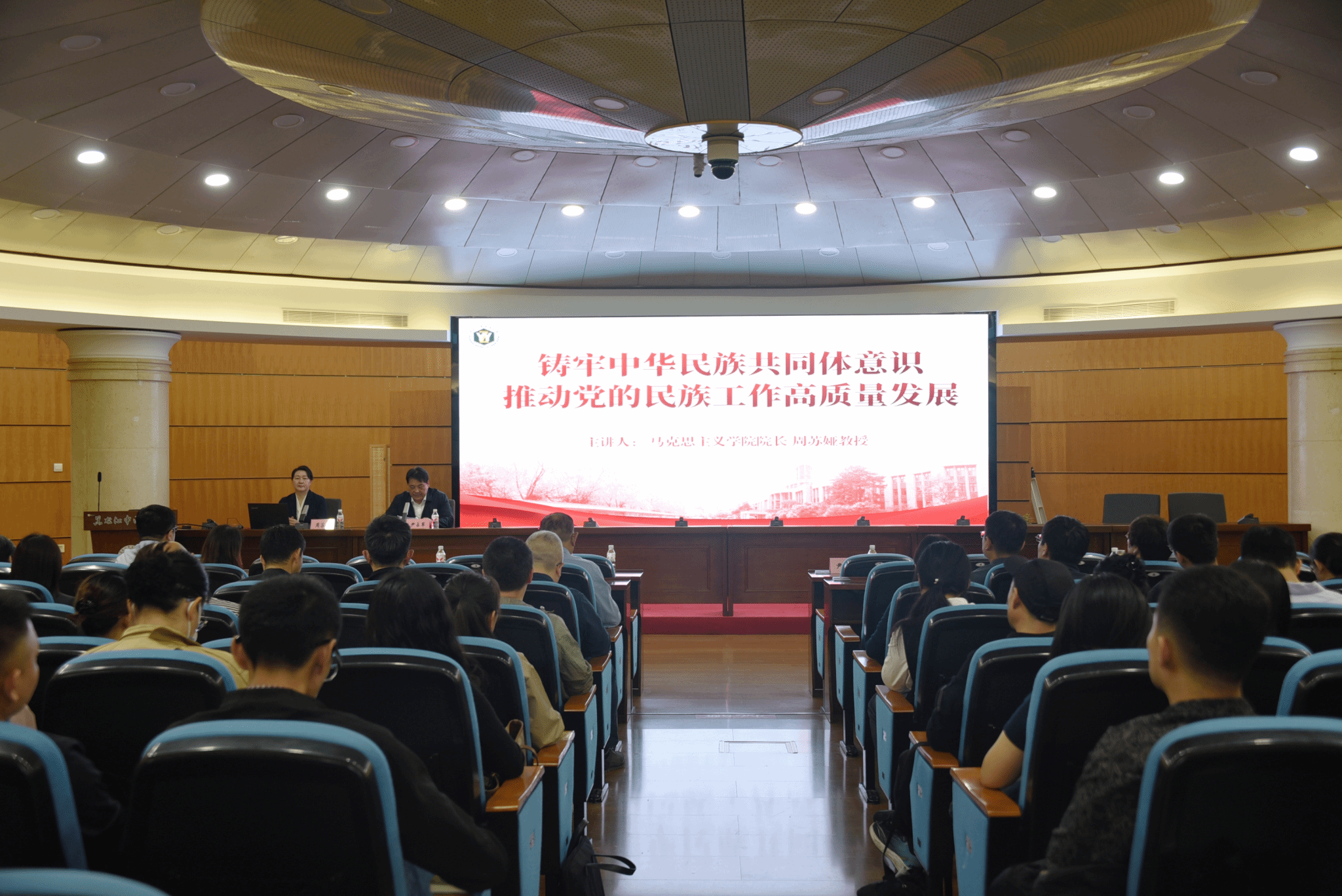 在题为《铸牢中华民族共同体意识 推动党的民族工作高质量发展》的讲座中,周苏娅教授以“铸牢中华民族共同体意识”为主线,从理论逻辑、历史脉络、实践路径三个维度进行了系统讲解。