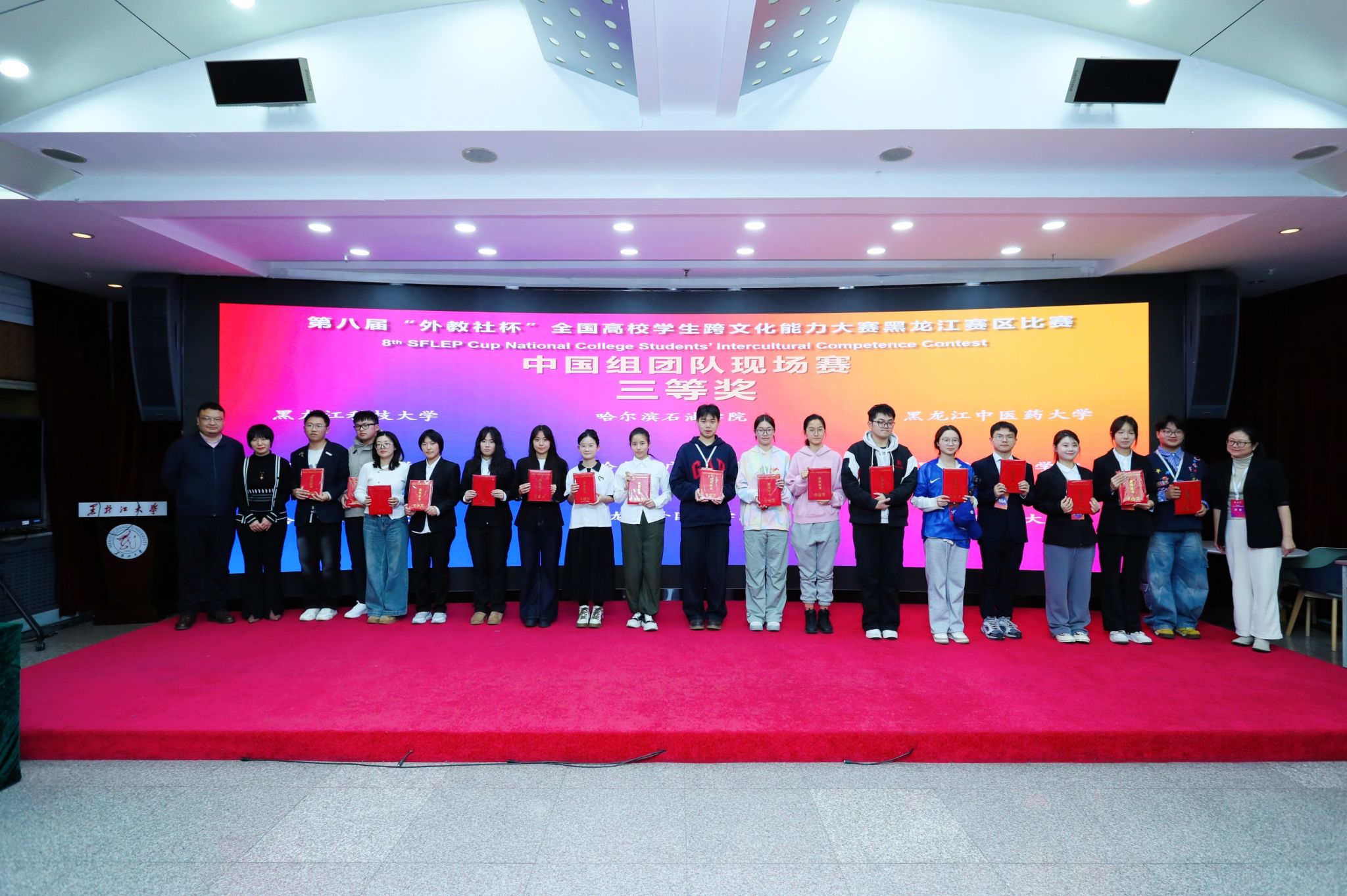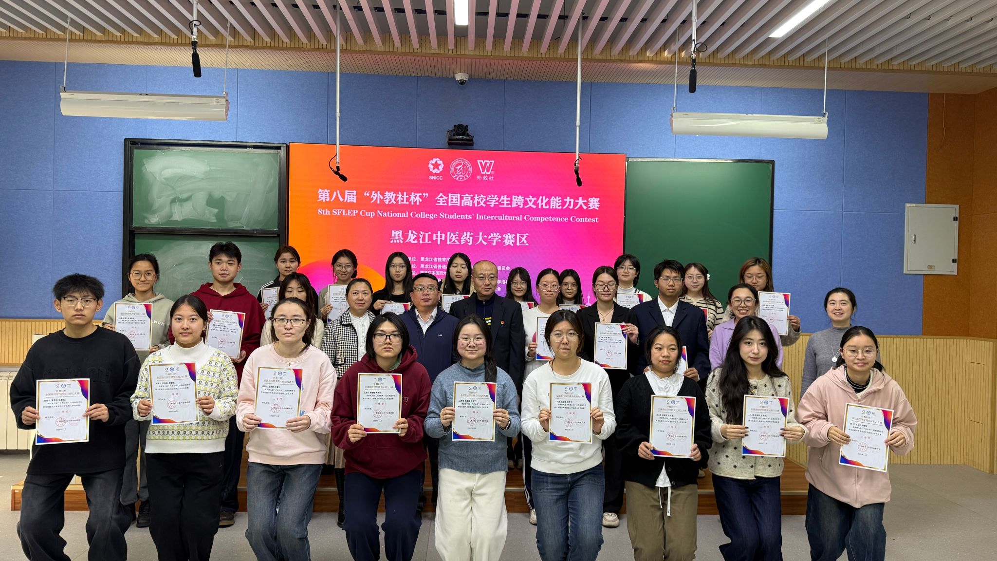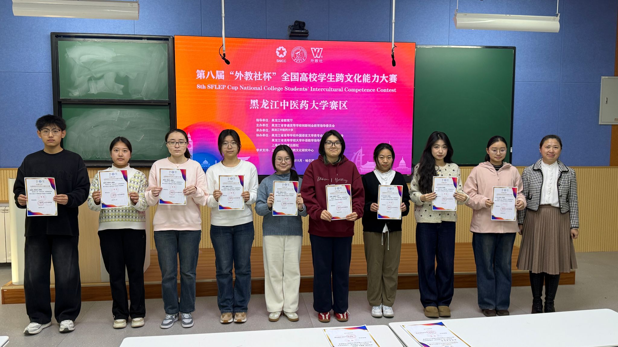 11月15日至16日,第八届“外教社杯”全国高校学生跨文化能力大赛在黑龙江大学举行,由我校选派的2024级中医学专业张馨月、2024级中药学(实验班)专业周思汎、2025级中医学(5+3一体化)专业张嘉太3名选手组成的团队,与来自全省高校的37支代表队同场竞技,最终荣获省级赛事的三等奖。